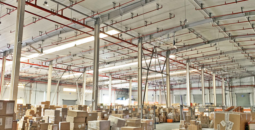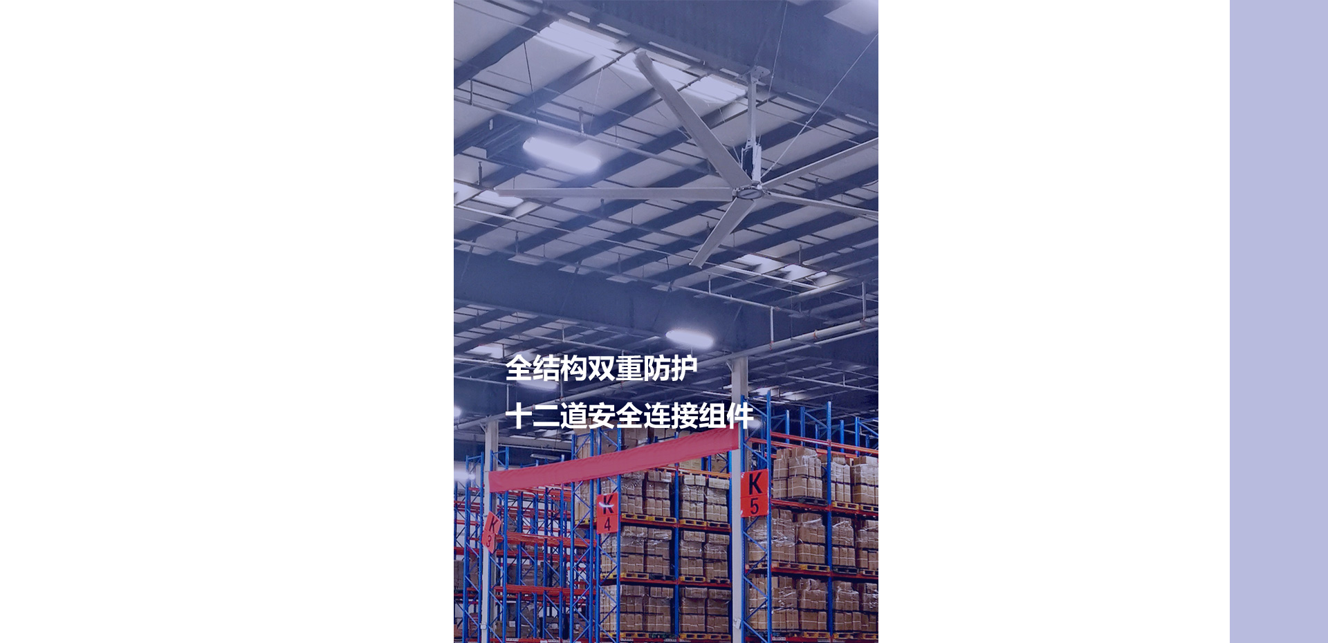 物流倉庫使用大型工業吊扇,能促進整個空間內外空氣流通,解決悶熱,平衡空氣濕度,有效避免其它通風方案的局限性(安全及能耗),改善工作環境。